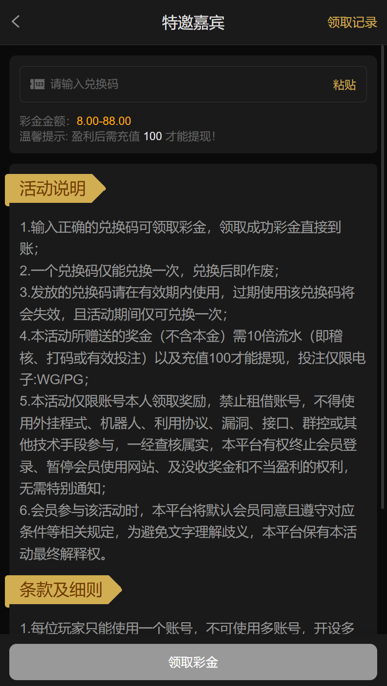 免费代码8-88:需要完成代码的10倍水,盈利后必须充值100元完成1倍打码,才可以提款。只能PG/WG电子游戏